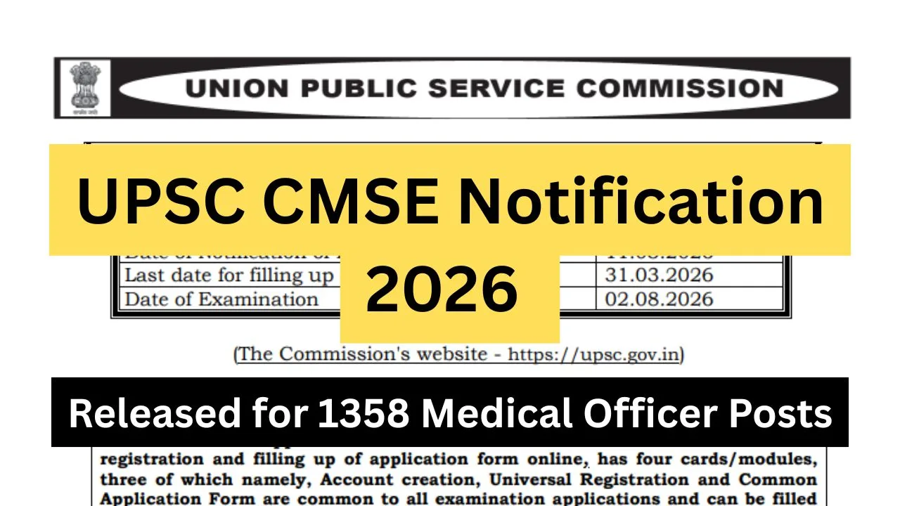 UPSC CMSE Notification 2026: The Union Public Service Commission has officially released the UPSC CMSE Notification 2026 on 11th March 2026 for the Combined Medical Services Examination. This recruitment exam at the national level has been conducted for the recruitment of eligible and qualified medical professionals in various central government health services. According to the official announcement made by the Union Public Service Commission regarding the recruitment notification for the Combined Medical Services Examination 2026 the tentative vacancies announced for the recruitment of eligible and qualified candidates for the posts of Medical Officer in the Central Health Service, Assistant Divisional Medical Officer in Indian Railways and General Duty Medical Officers in NDMC and MCD have been announced at 1358 vacancies. The online registration for the recruitment notification has been initiated from 11th March 2026 and can be completed by eligible and interested candidates until 31st March 2026 through the official website of the UPSC online portal. The written test for the recruitment of eligible and qualified candidates for the Combined Medical Services Examination 2026 has been scheduled for 2nd August 2026 at various centers in India. This specifc post contains all the verified information regarding UPSC CMSE Notification 2026 and the details related to it.